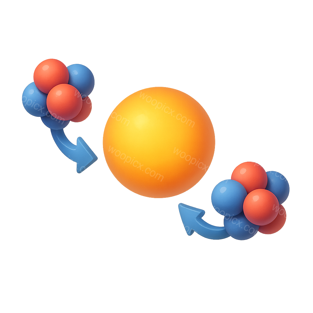 /Premium/Collection: /by davooda/Type: PNG/A visually striking 3D icon representing nuclear fusion, featuring colorful atoms with an orange central sphere and blue and red clusters. The design has a transparent background and a three-quarter isometric view.