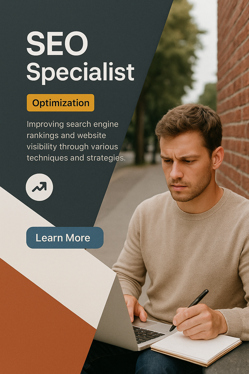 /Collection: /by davooda/Type: PNG/A professional image featuring a focused SEO specialist working on optimization strategies. The layered composition includes a visually appealing background with geometric shapes and clear text hierarchy.