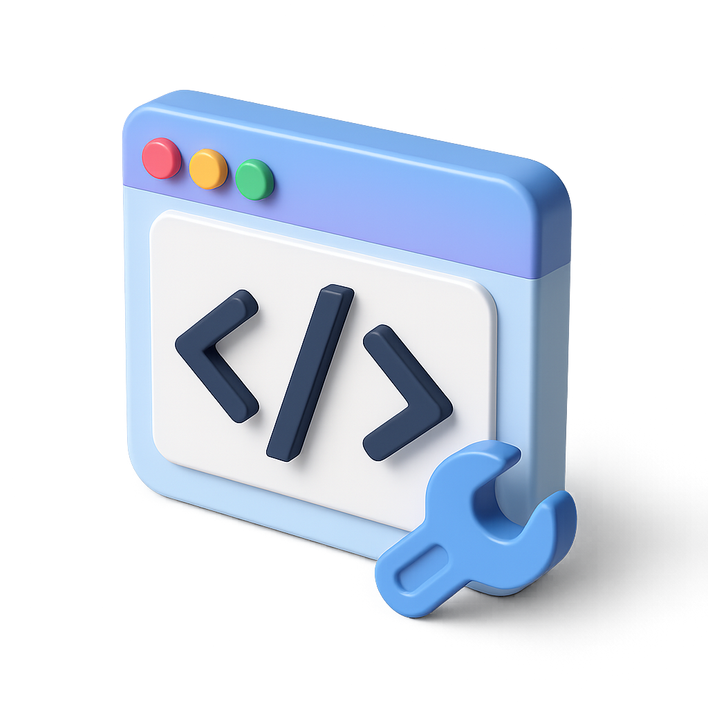 A visually engaging 3D icon representing frontend development, featuring a code window and a wrench. The design showcases a three-quarter view with a smooth, isometric aesthetic.