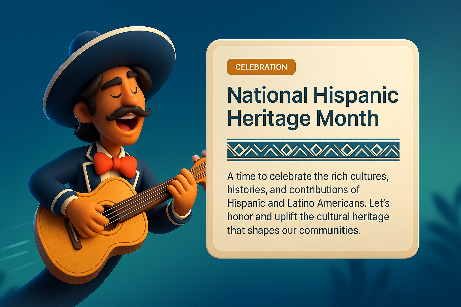 /Collection: /by davooda/Type: PNG/A vibrant graphic celebrating National Hispanic Heritage Month, featuring a musician and cultural motifs. Ideal for social media or community events.