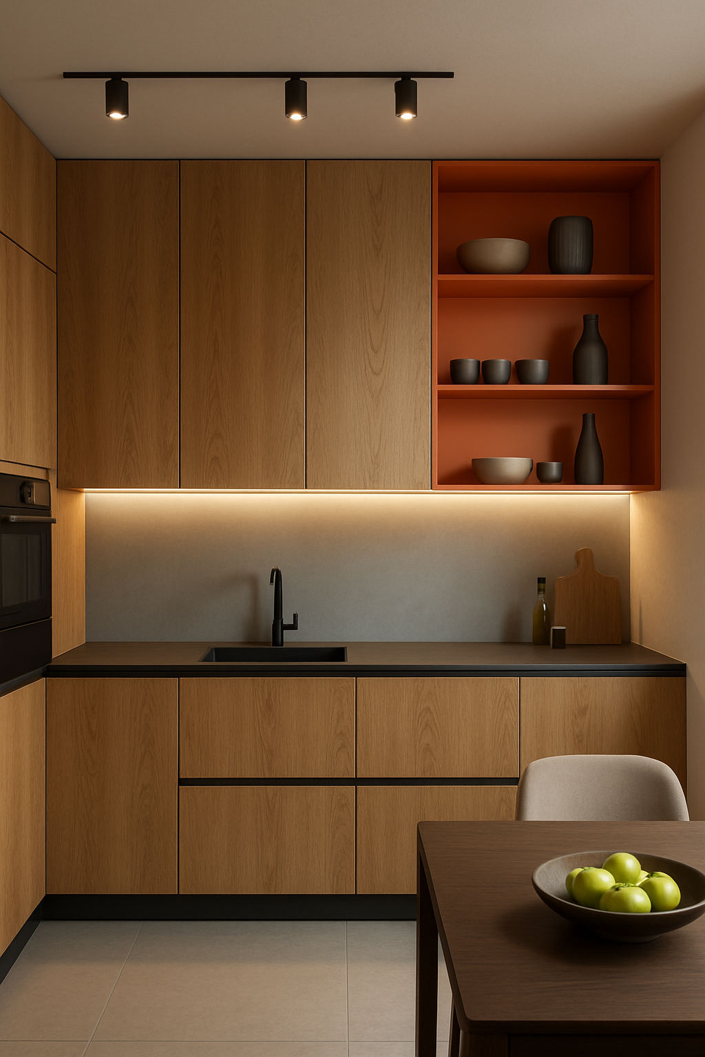Modern Minimalist Kitchen with Warm Lighting and Wood Accents