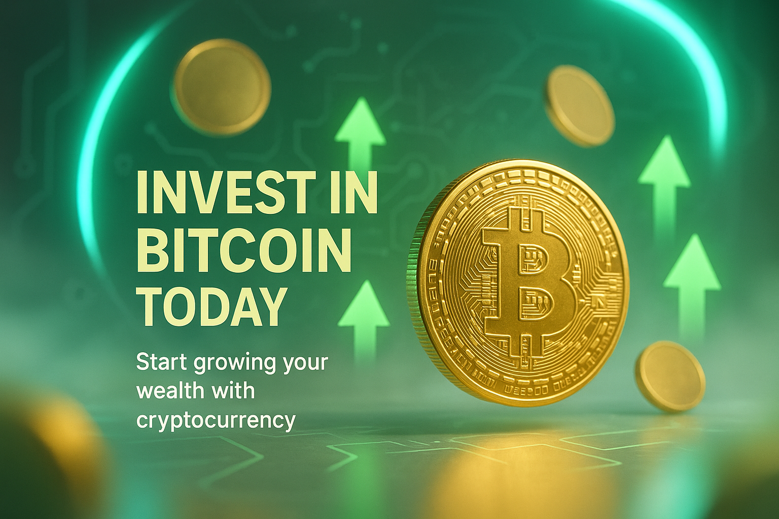 /Collection: /by davooda/Type: PNG/Vibrant promotional graphic highlighting the benefits of investing in Bitcoin. The design incorporates modern cryptocurrency elements, making it ideal for financial marketing.