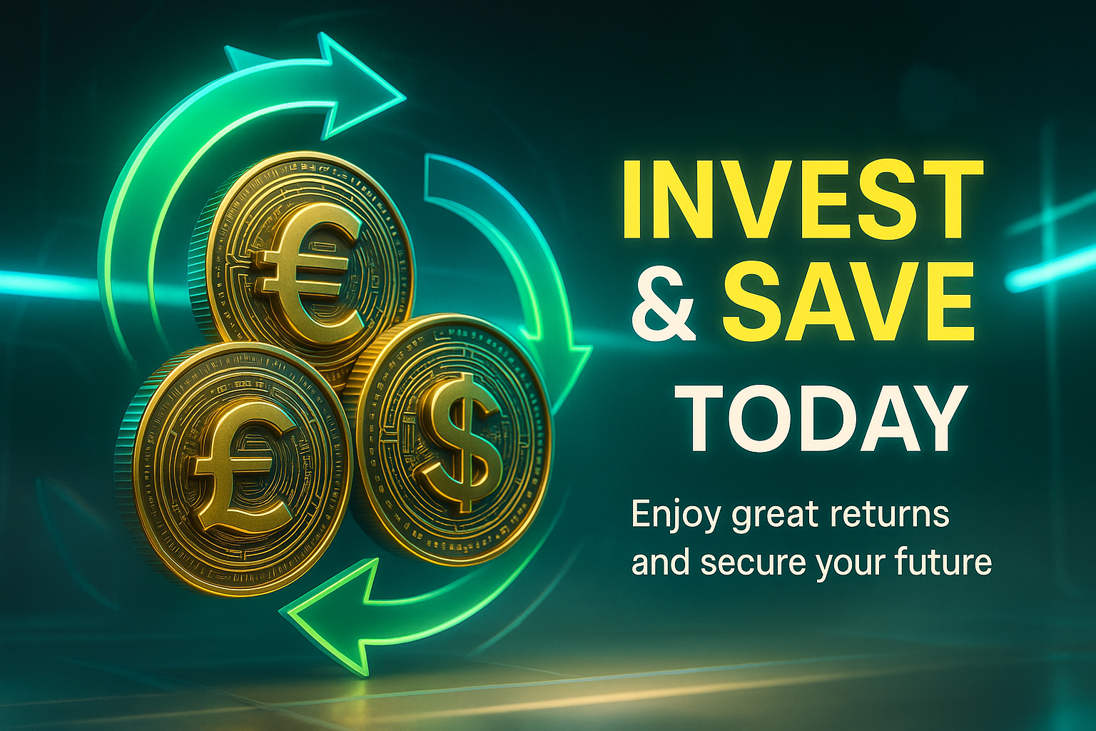 /Collection: /by davooda/Type: PNG/Vibrant promotional image showcasing stylized coins and arrows, designed to encourage investment and savings, ideal for financial services marketing.