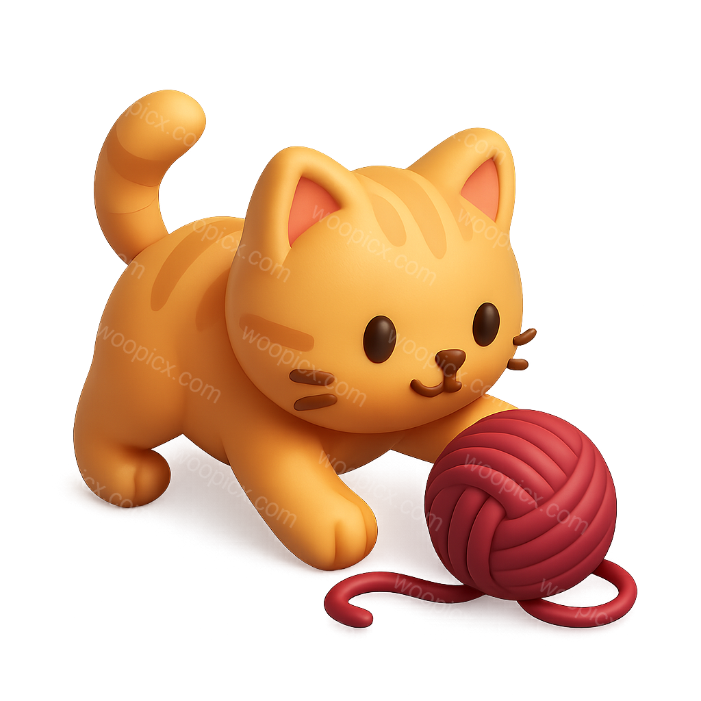 A cute 3D rendered kitten with orange stripes, playfully engaging with a red yarn ball. The design emphasizes a glossy and volumetric style on a soft gradient background.