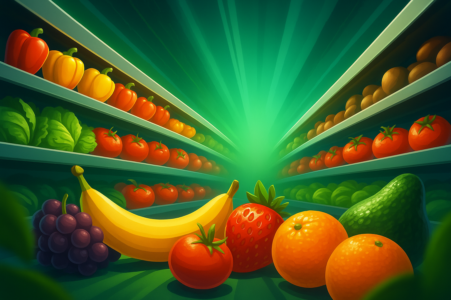 /Collection: /by davooda/Type: PNG/A dynamic, colorful arrangement of fruits and vegetables on refrigerated shelves in a supermarket. The composition features a variety of produce with a vibrant backdrop and engaging depth.