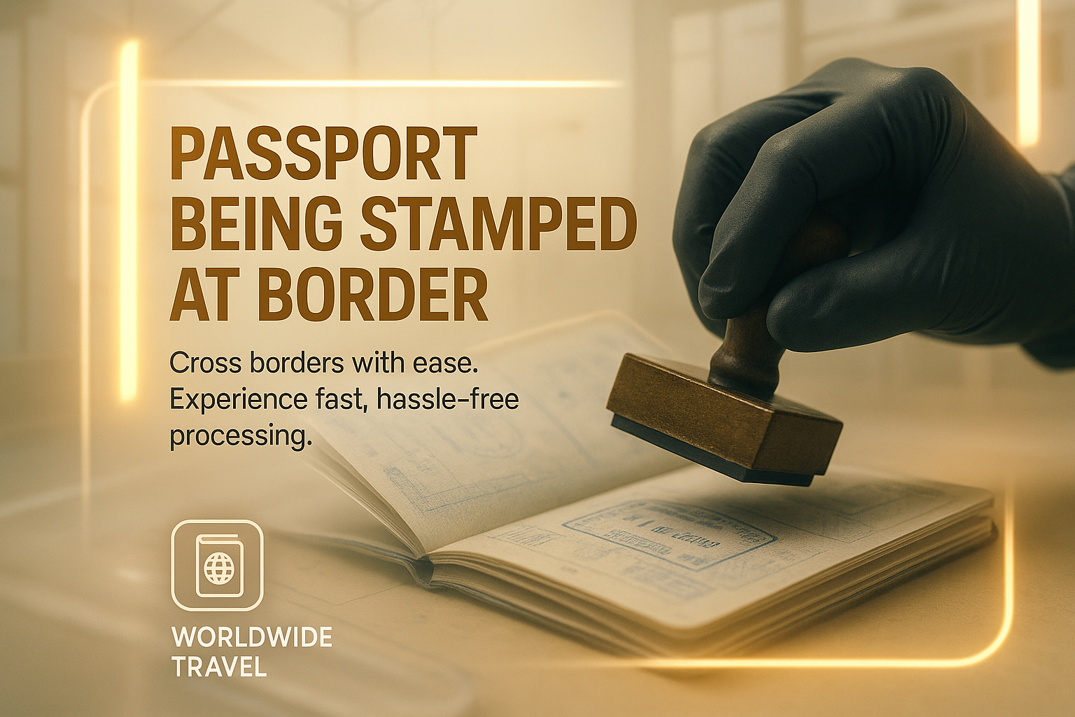 A travel-themed image showcasing a hand stamping a passport, symbolizing ease of border crossing. The modern design and warm tones make it suitable for travel-related marketing.