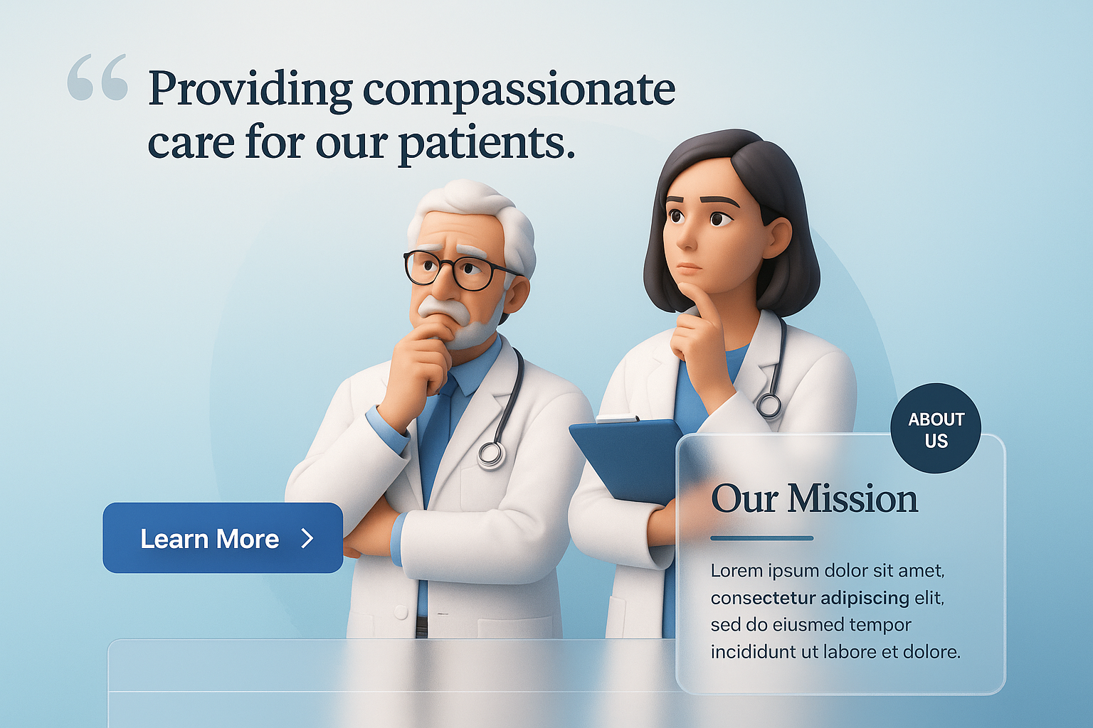 A 3D illustration of male and female doctors pondering over a notebook. Features a quote block and an action button, emphasizing compassionate care for patients.