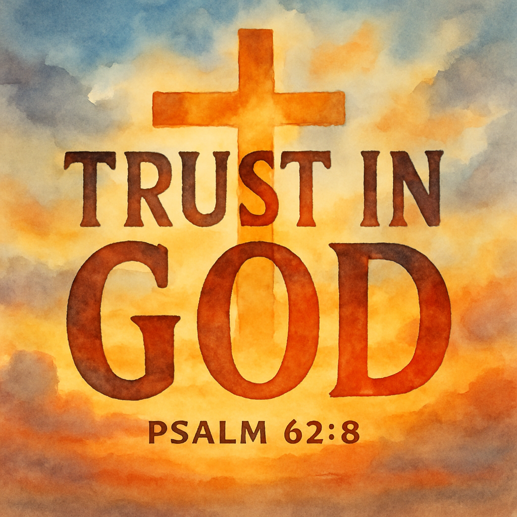 /Collection: /by davooda/Type: PNG/A serene watercolor illustration featuring a cross against a colorful sky with the text 'Trust in God' and a scripture reference. Ideal for religious inspiration or faith-based content.