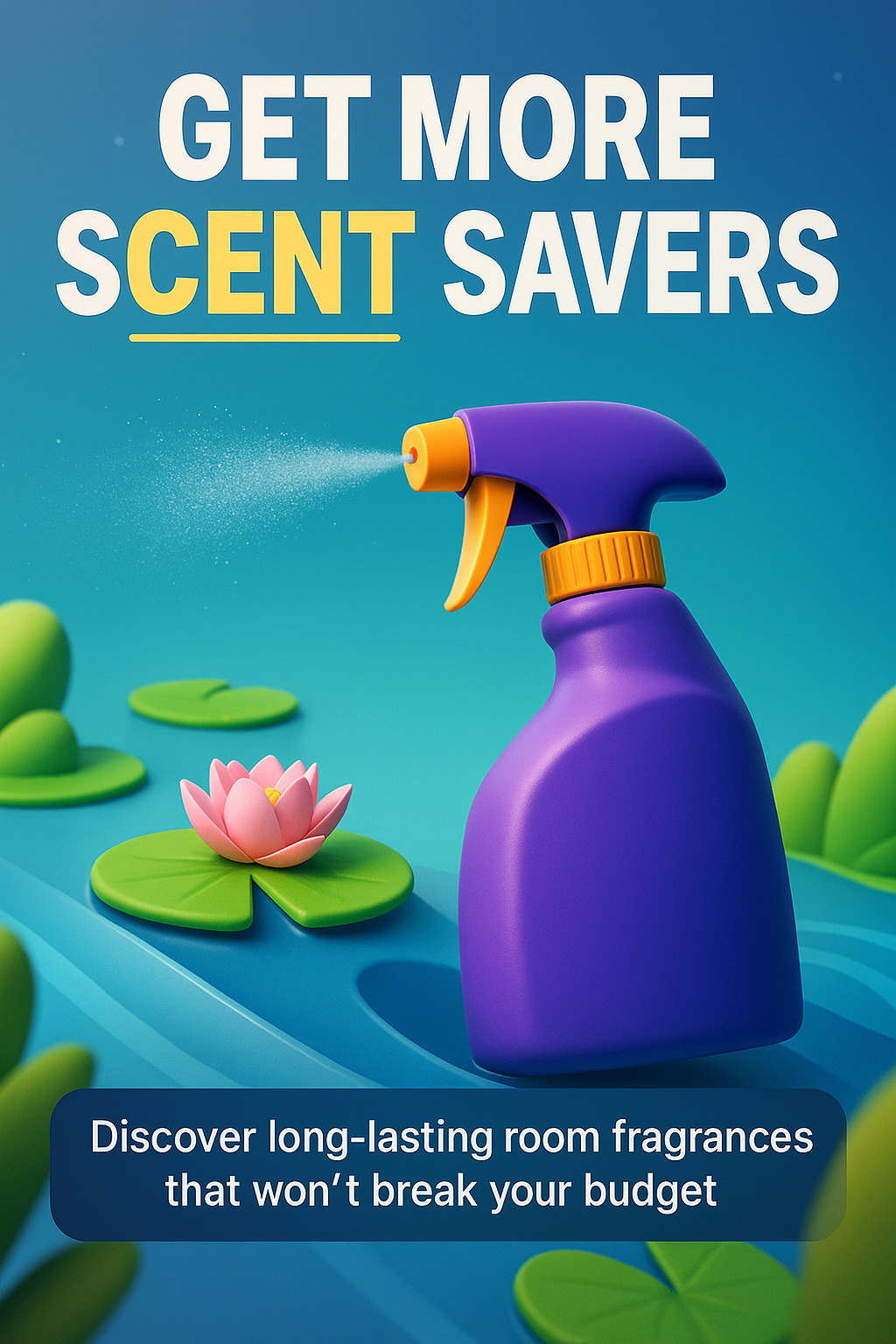 A vibrant 3D illustration showcasing a purple spray bottle for room fragrances amidst green lily pads. The design features a smooth gradient background and clear, readable text.