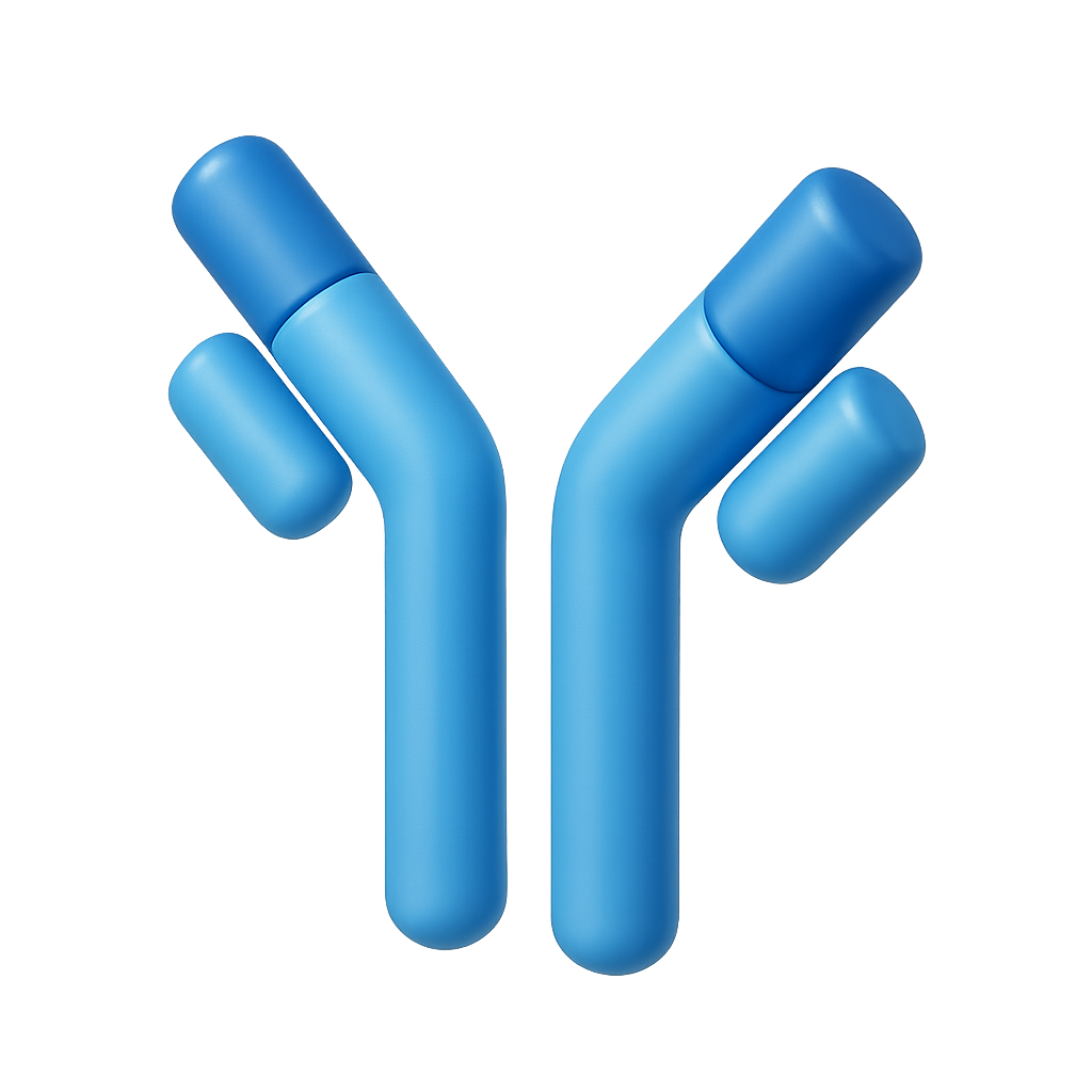 This image features a modern 3D representation of an antibody icon in a three-quarter view. The design showcases a sleek, volumetric blue structure on a subtle gradient background.