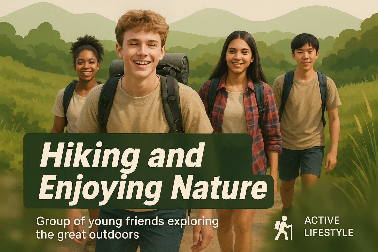 Vibrant social media post showcasing a group of young friends hiking in a scenic outdoor setting, promoting an active lifestyle. Ideal for wellness and adventure campaigns.