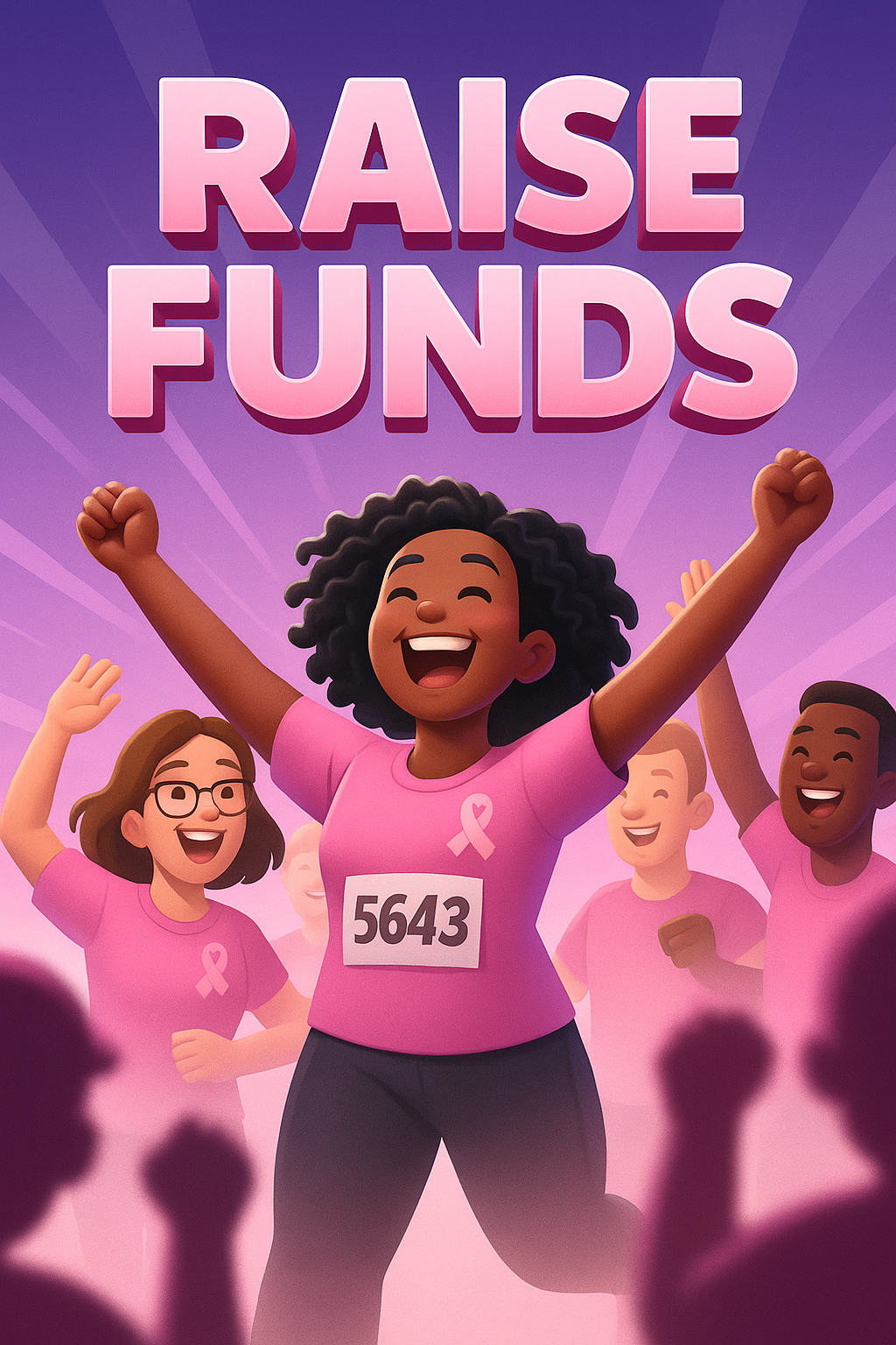 /Collection: /by davooda/Type: PNG/A vibrant scene featuring a joyful woman and friends at a breast cancer fundraising walk, exuberantly raising funds while dressed in pink. The background showcases dynamic rays emanating from the center.