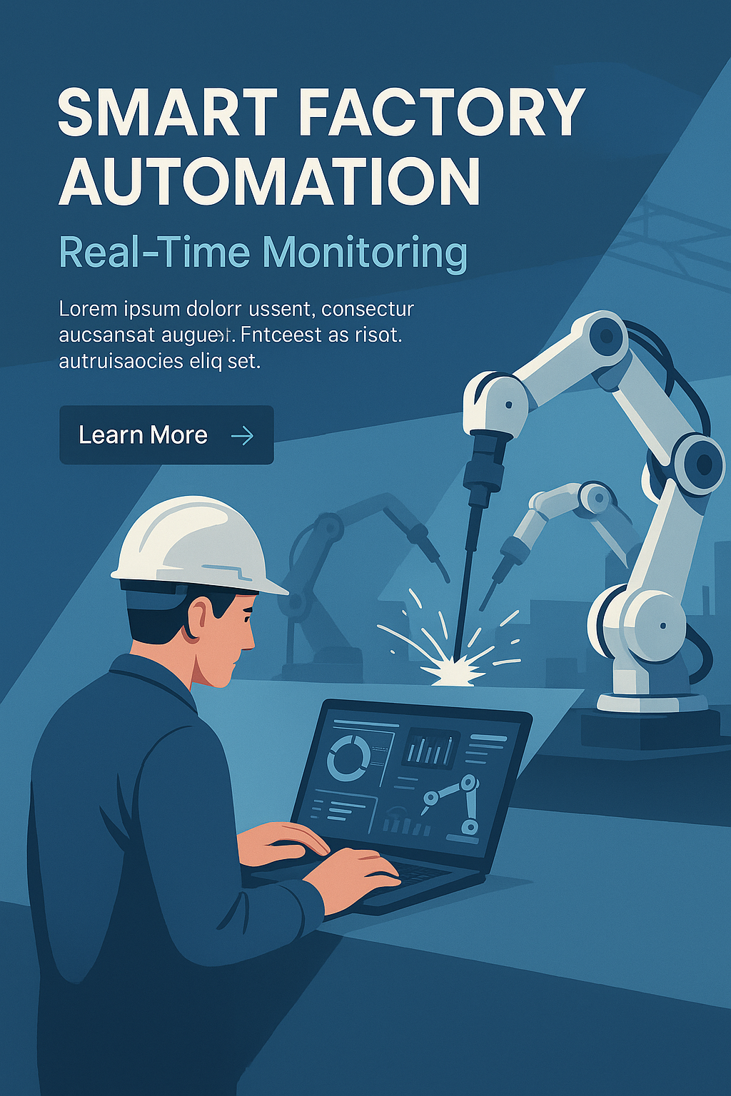 /Collection: /by davooda/Type: PNG/An engineer manager monitors robot arm automation in a smart factory setting. The scene showcases real-time software monitoring, welding robots, and digital manufacturing operations, with a balanced and professional design.