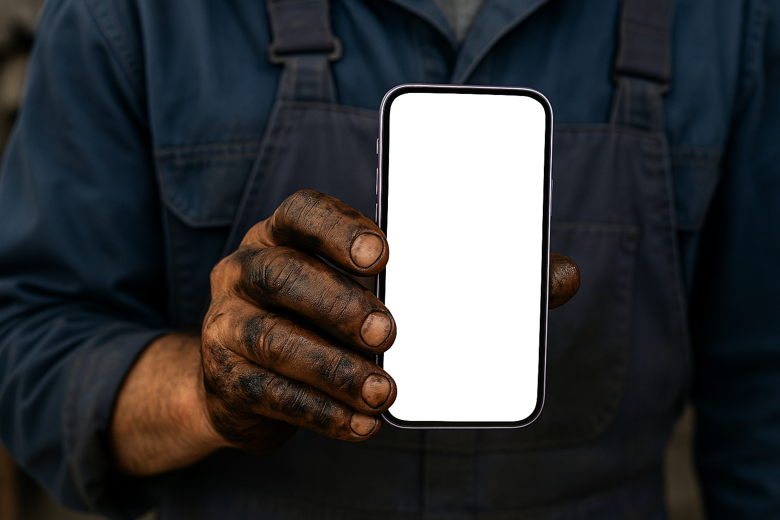 A mechanic in work overalls holds a purple phone with oily hands, displaying a blank white screen. The focus is on the contrast between the dirty hands and the clean phone.