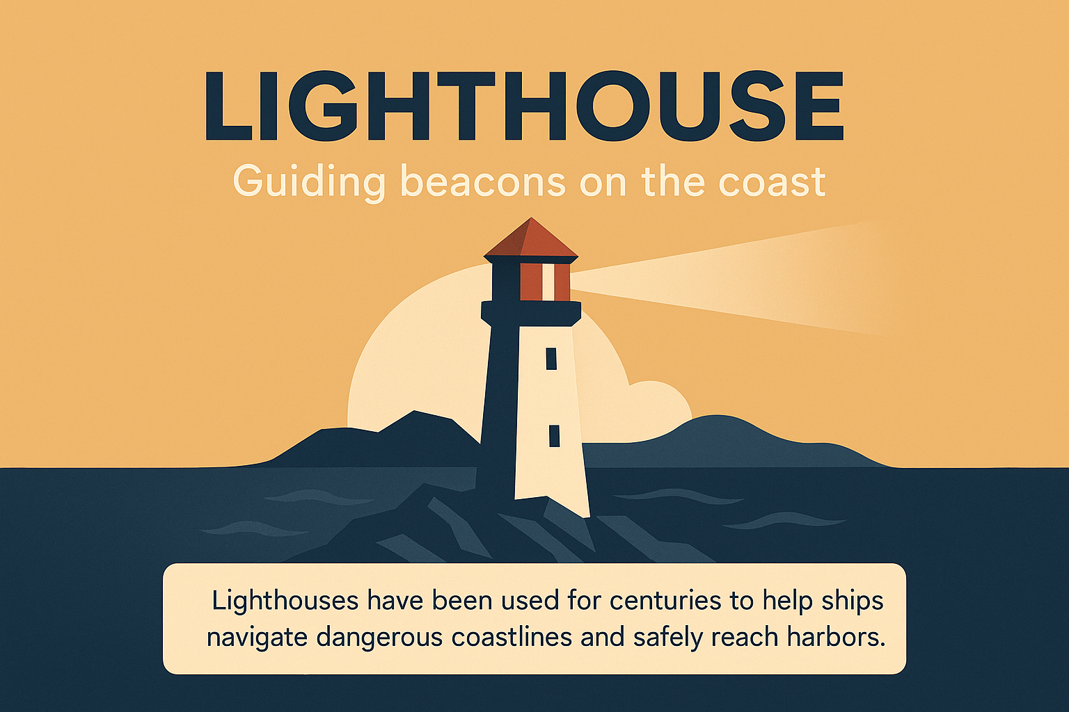 /Collection: /by davooda/Type: PNG/A visually appealing lighthouse design set against a warm gradient background. The composition includes a lighthouse with a guiding beam and informative text below.