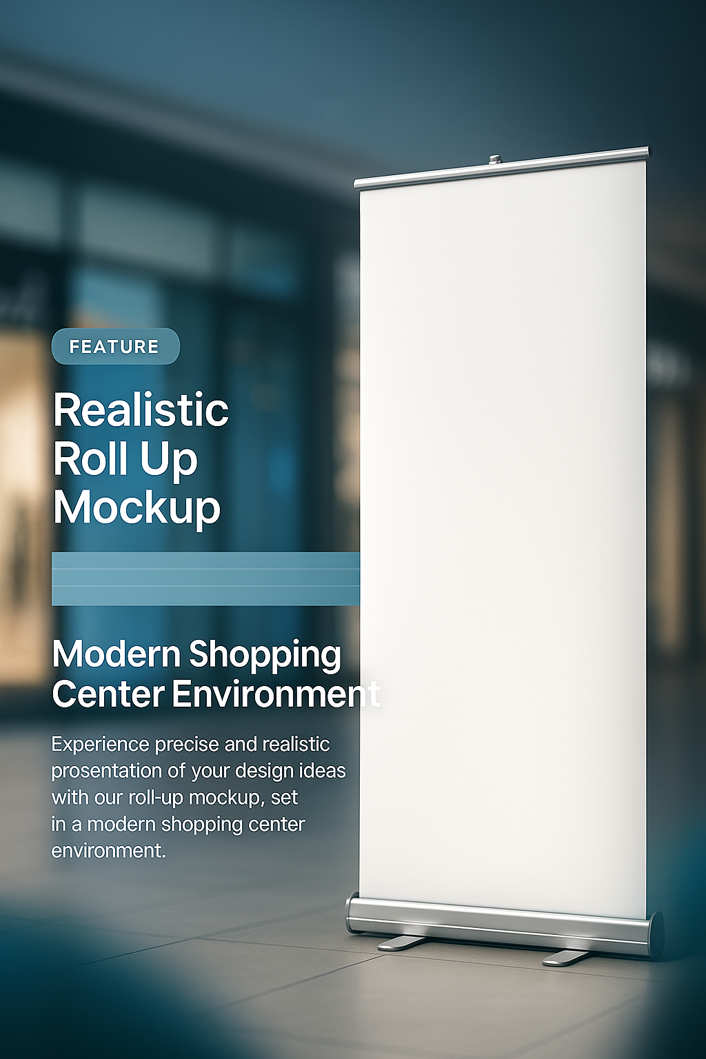 /Collection: /by davooda/Type: PNG/This image showcases a roll-up mockup poster stand set in a modern shopping center, featuring a sleek design with ample blank space for customization. The environment is stylish and inviting.