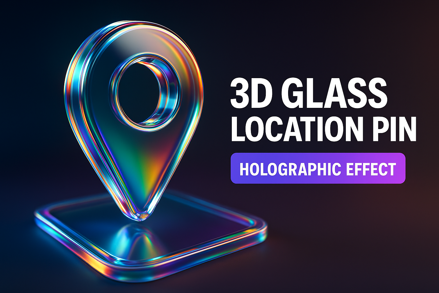 A visually striking 3D rendering of a glass location pin showcasing a holographic effect. Ideal for digital maps or location-based applications, this graphic emphasizes modern design elements.