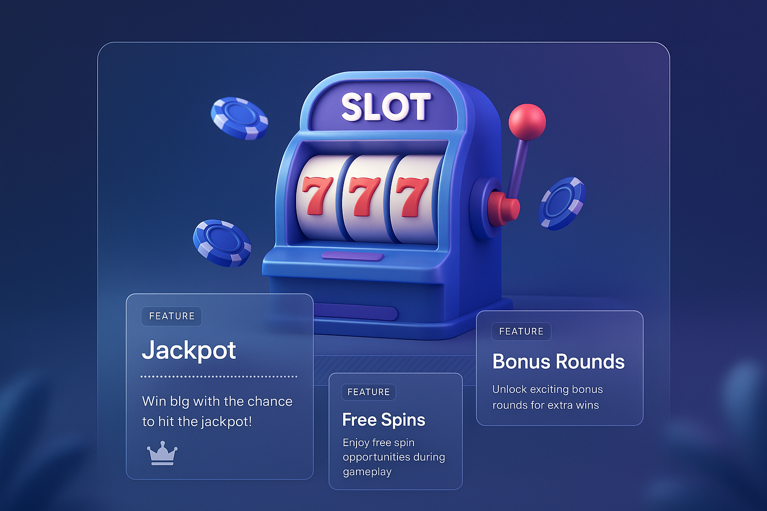 /Collection: /by davooda/Type: PNG/A vibrant 3D illustration of a slot machine with '777' symbols. It features blocks highlighting game features like Jackpot and Free Spins, enhanced with a smooth gradient background.