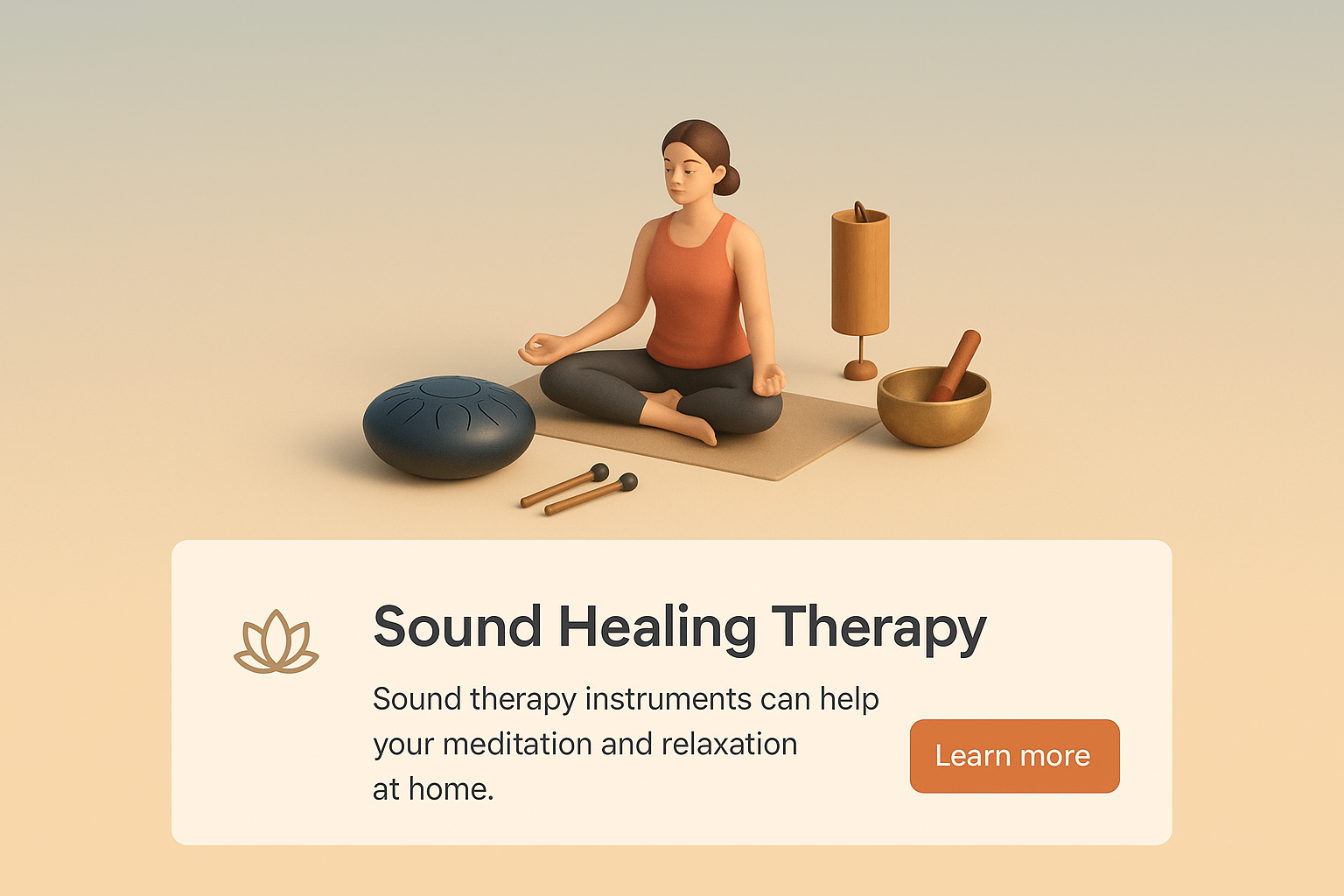 /Collection: /by davooda/Type: PNG/A serene 3D scene depicting a woman meditating with sound therapy instruments. The design features a calming gradient background and a clear, readable text block promoting relaxation at home.