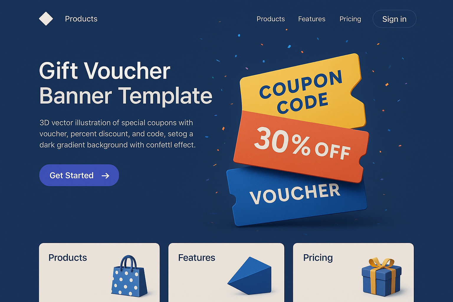 A visually appealing landing page design featuring a gift voucher template. It includes sections for products, features, and pricing, set against a deep blue background.