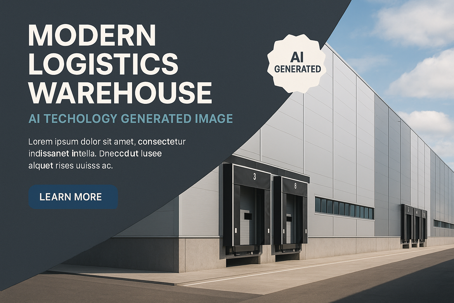 /Collection: /by davooda/Type: PNG/A modern logistics warehouse featuring AI-generated design elements, including a structured layout, contrasting text, and a clear call-to-action button. The image captures realism and balanced composition.