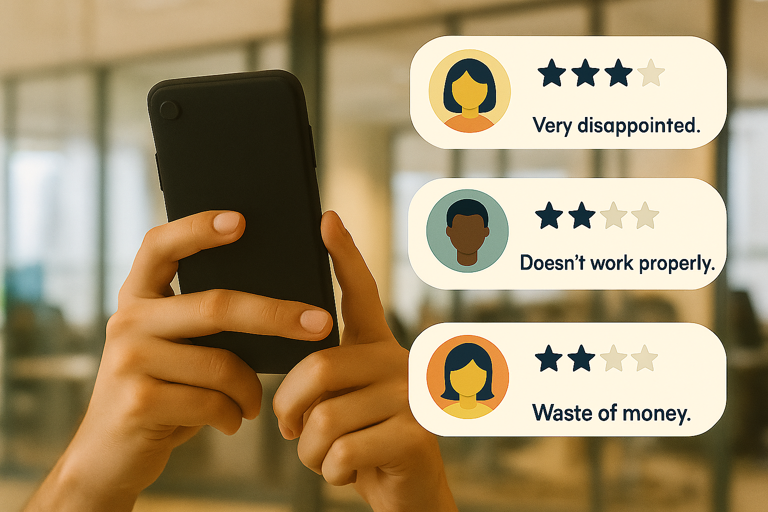 An illustrative graphic depicting customer reviews with star ratings and comments, emphasizing user dissatisfaction. Ideal for product feedback or service evaluation visuals.