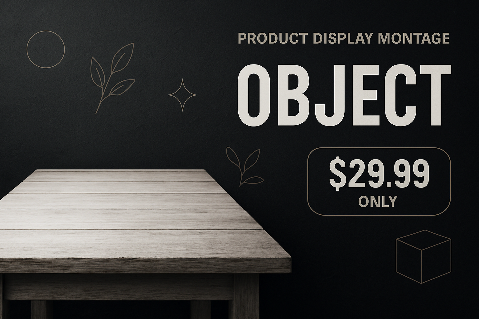 /Collection: /by davooda/Type: PNG/A clean, modern product display featuring a wooden table against a textured white wall. Bold typography highlights the product's price and name, creating an inviting advertisement.