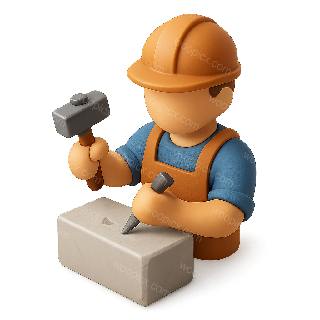 A 3D icon depicting a mason stone cutter in a three-quarter view. The figure is equipped with a hammer and chisel, wearing a hard hat and work attire, set against a soft, gradient background.