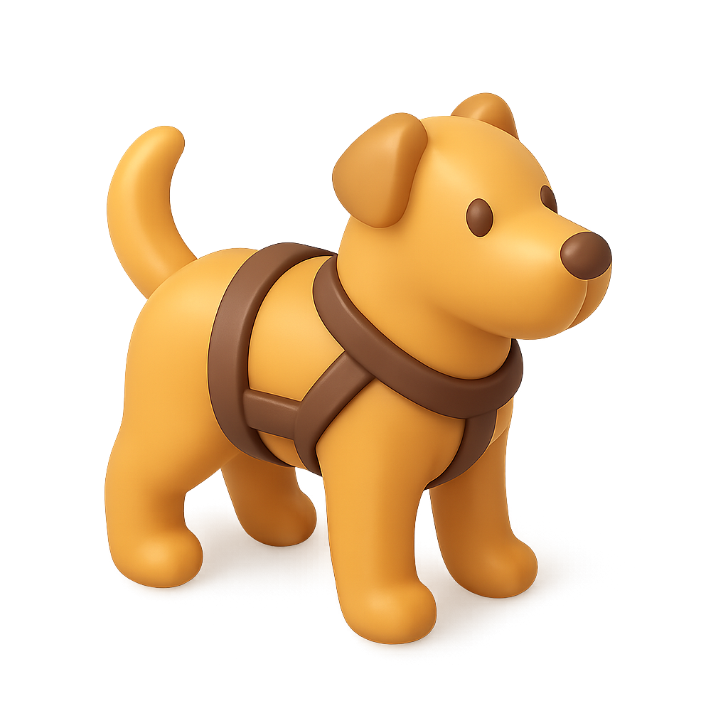 /Collection: /by davooda/Type: PNG/A stylized 3D icon of a dog wearing a brown harness, depicted in a three-quarter view. The design features a smooth, rounded shape and a warm color palette against a soft gradient background.
