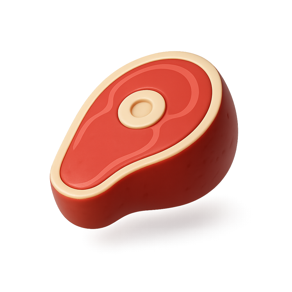 A vibrant 3D representation of a meat icon viewed from a three-quarter angle, showcasing its volumetric shape and smooth surface against a soft background.
