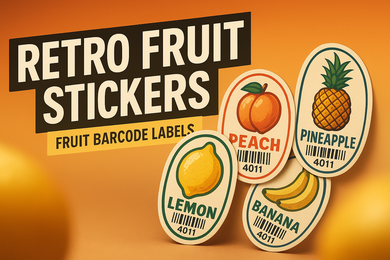 A vibrant graphic featuring retro-style fruit stickers with barcodes, ideal for food packaging or branding. The design includes colorful illustrations of various fruits.