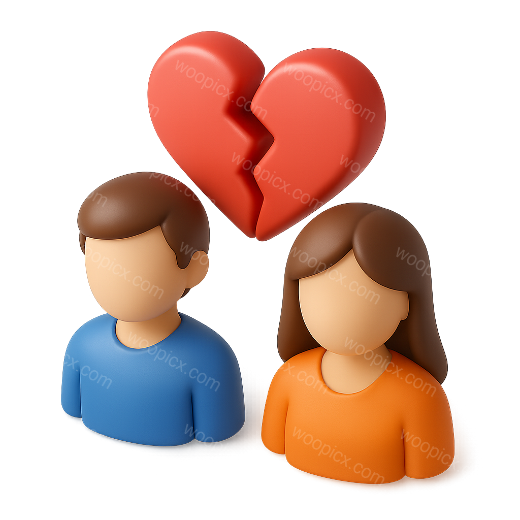 /Premium/Collection: /by davooda/Type: PNG/A vibrant 3D icon depicting a broken heart between two stylized characters, showcasing emotions of breakup. The characters are simple and colorful, enhancing the theme.