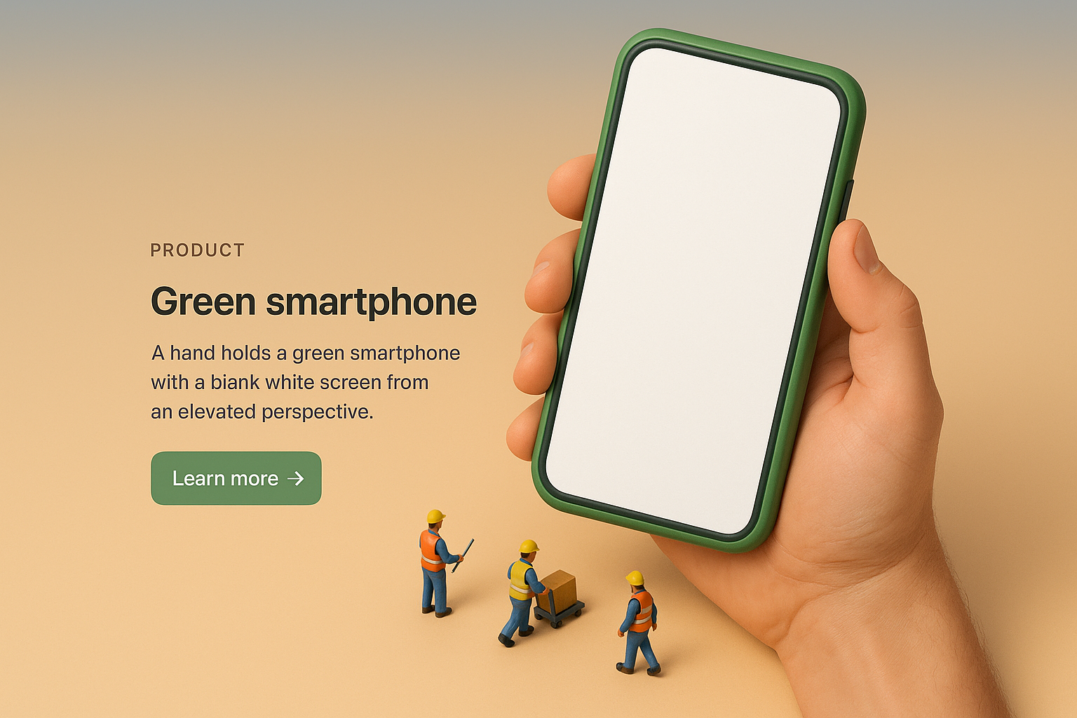 A hand holding a green smartphone with a blank screen, viewed from above. Tiny figures work nearby, creating a sense of scale and context in a minimalistic design.