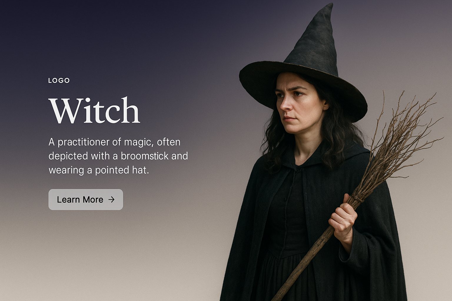 A stylish depiction of a witch holding a broomstick, ideal for web design. Features a gradient background and a clear layout for text and buttons.