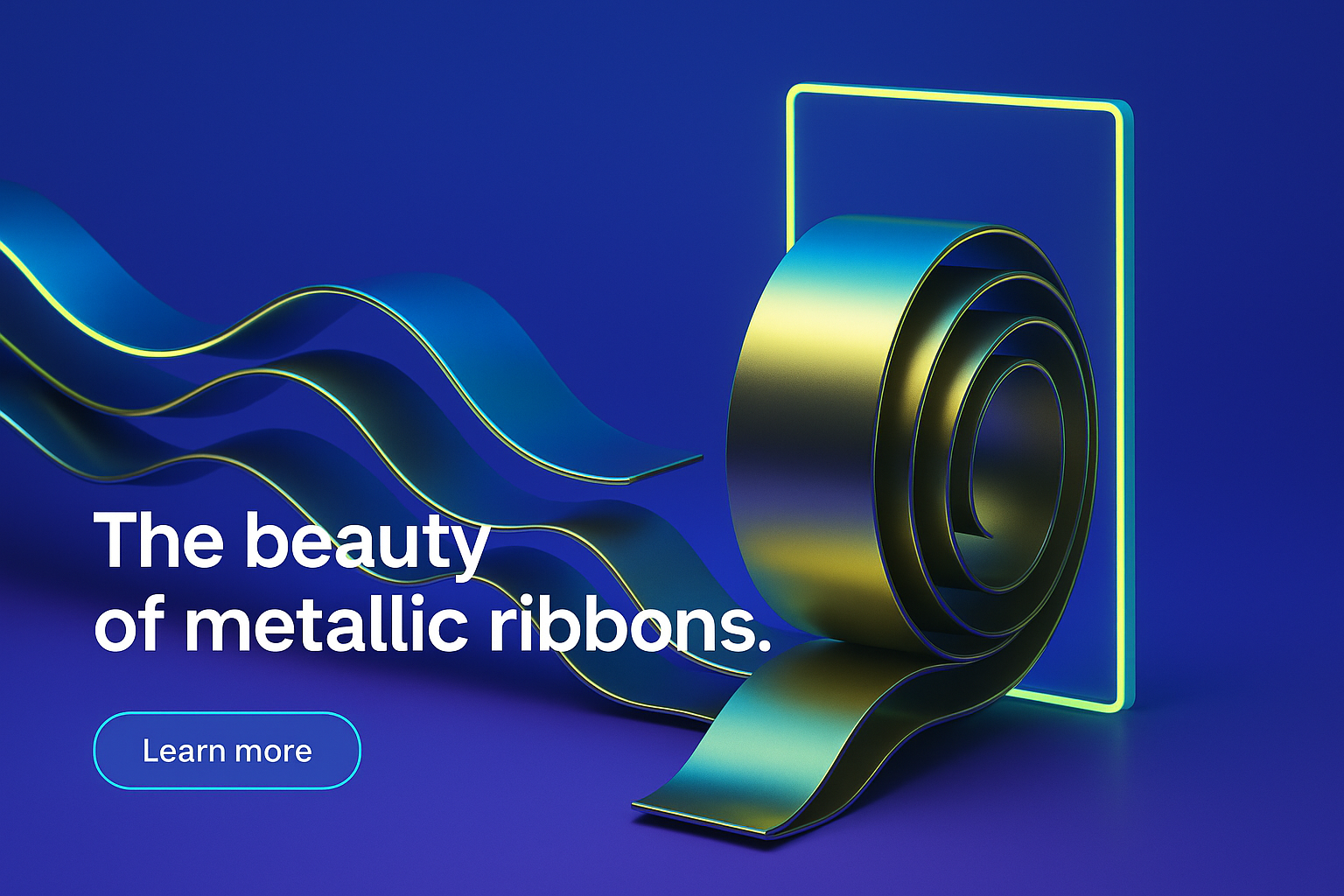 /Collection: /by davooda/Type: PNG/This image features a 3D metallic ribbon rolled up, set against a vibrant blue background. Neon accents illuminate the scene, enhancing the ribbon's glossy finish.