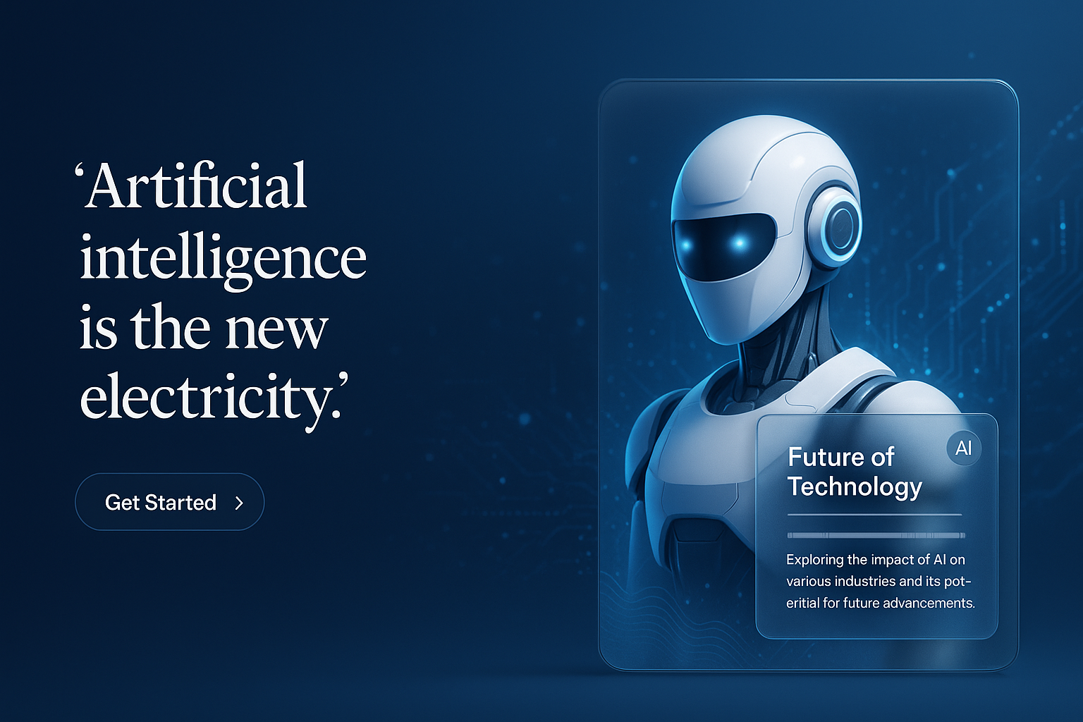 This image showcases a futuristic web design featuring a 3D robot and a sleek layout. The design highlights the theme of artificial intelligence with a quote and an action button.