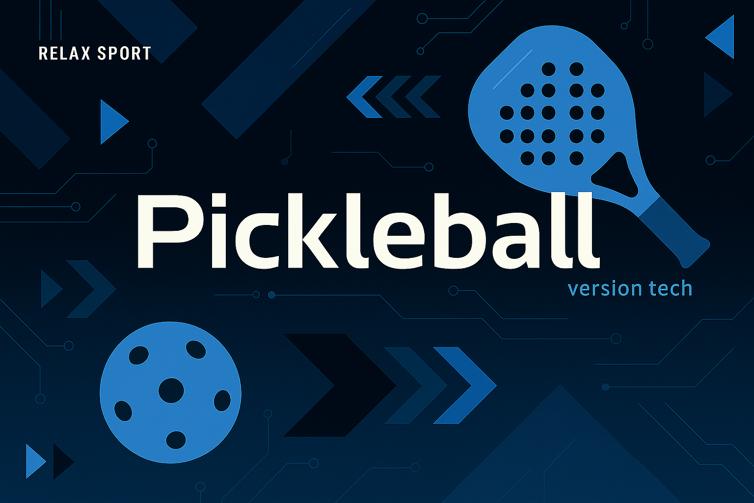 This image features a modern design for pickleball, emphasizing technology with a dark background and blue accents. It showcases a paddle and ball with geometric patterns.