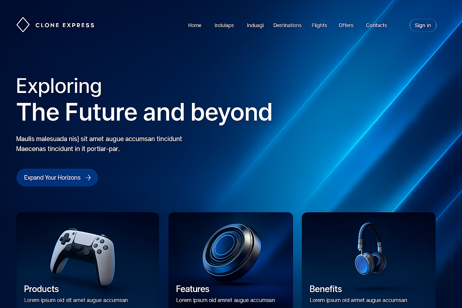 /Collection: /by davooda/Type: PNG/A visually striking landing page design featuring a modern blue abstract background, small sans-serif typography, and dynamic diagonal lines. The layout includes sections for products, features, and benefits with an energetic and futuristic feel.