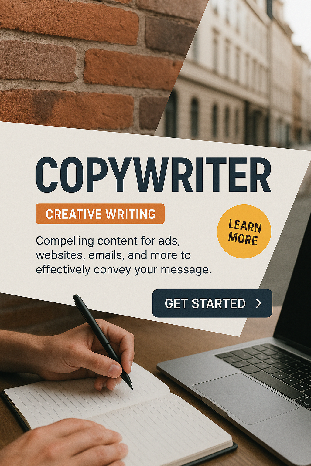 /Collection: /by davooda/Type: PNG/A captivating image showcasing a copywriter's workspace, featuring a notepad, pen, and a laptop. The design includes vibrant text elements and a striking background.
