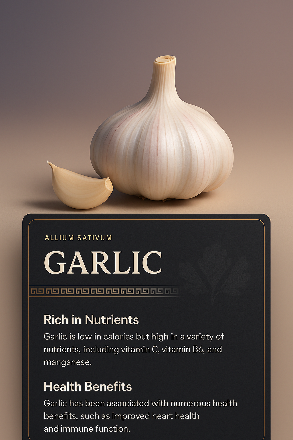 A realistic 3D rendering of garlic with an elegant dark information panel showcasing its health benefits and nutrient content, set against a smooth gradient background.