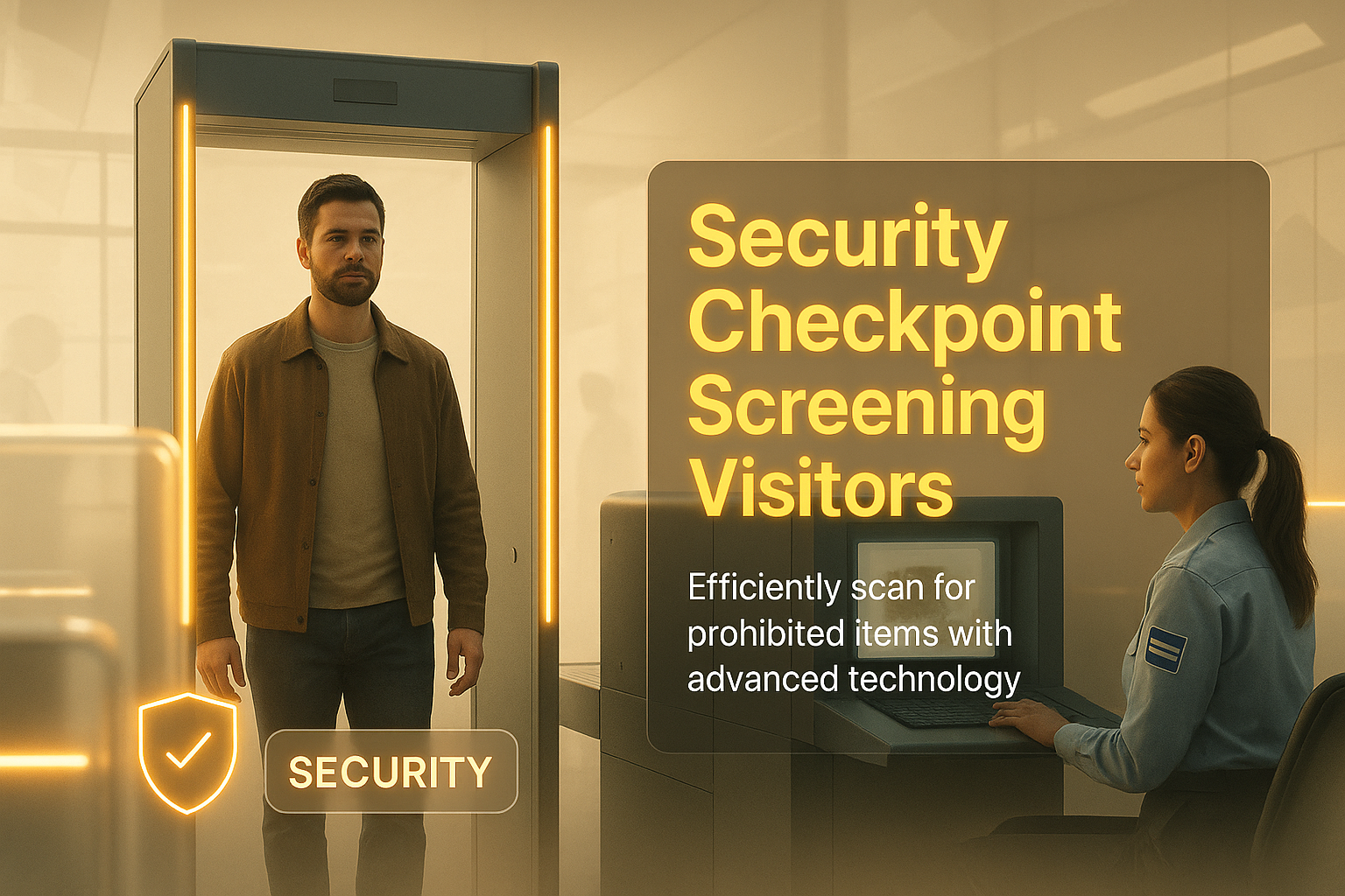 /Collection: /by davooda/Type: PNG/A digital illustration depicting a security checkpoint where visitors are scanned for prohibited items. The modern design emphasizes advanced technology and efficient processes, suitable for security-related communications.