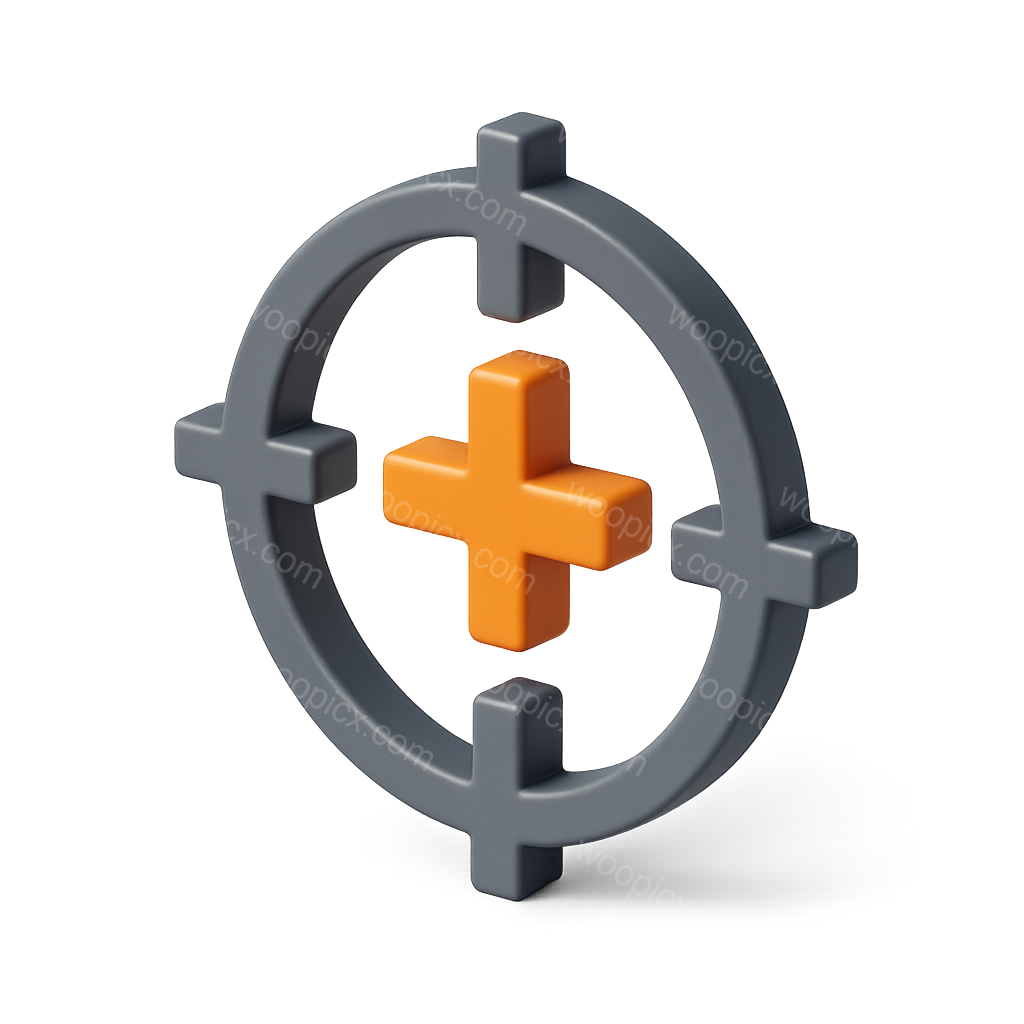 A sleek 3D icon featuring a targeting crosshairs design with a central orange plus symbol. The icon has a transparent background and presents a three-quarter view with a volumetric effect.