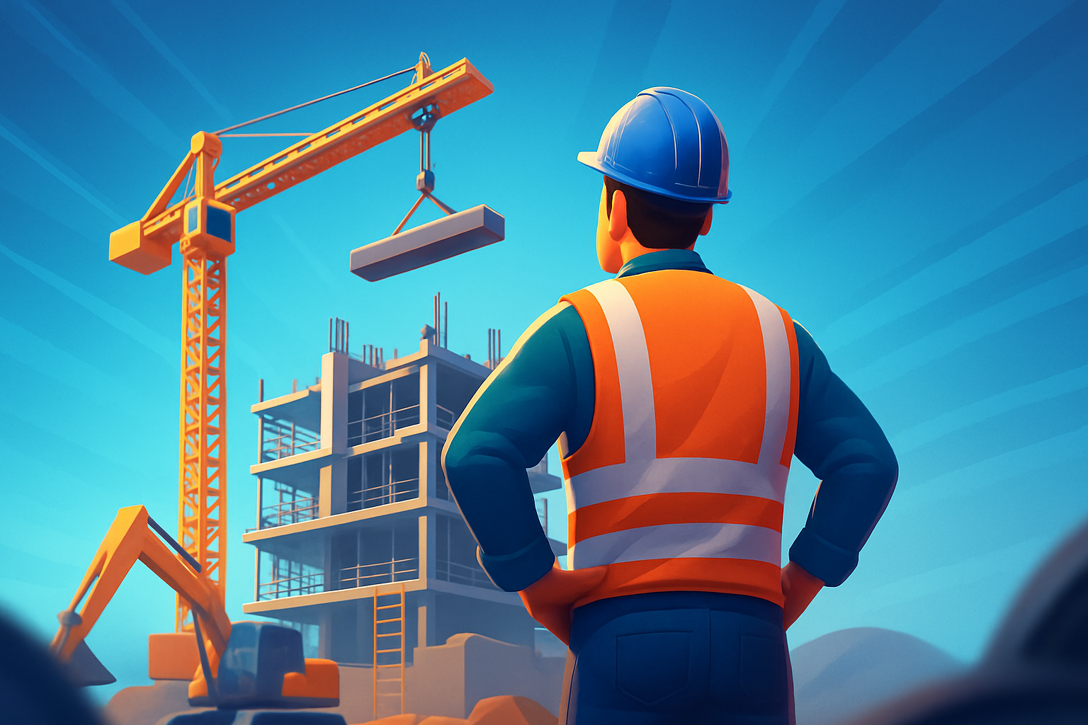/Collection: /by davooda/Type: PNG/A civil engineer in a safety vest observes a construction site with a crane and building framework. The scene features dynamic lines and vibrant colors, emphasizing the engineering process.