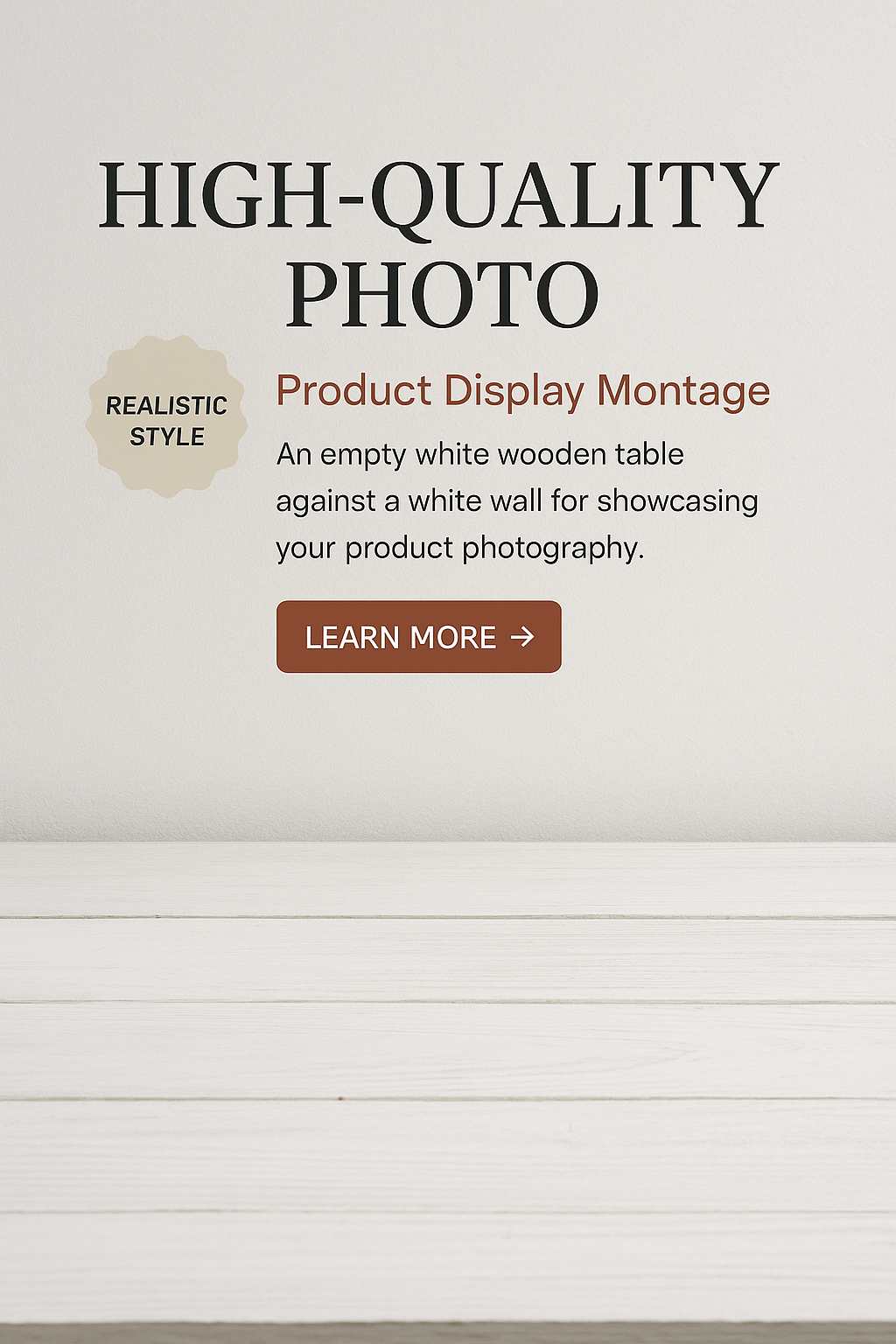 /Collection: /by davooda/Type: PNG/A high-quality photo featuring an empty white wooden table against a white wall, ideal for showcasing products. The design includes a title, subtitle, and a call-to-action button.