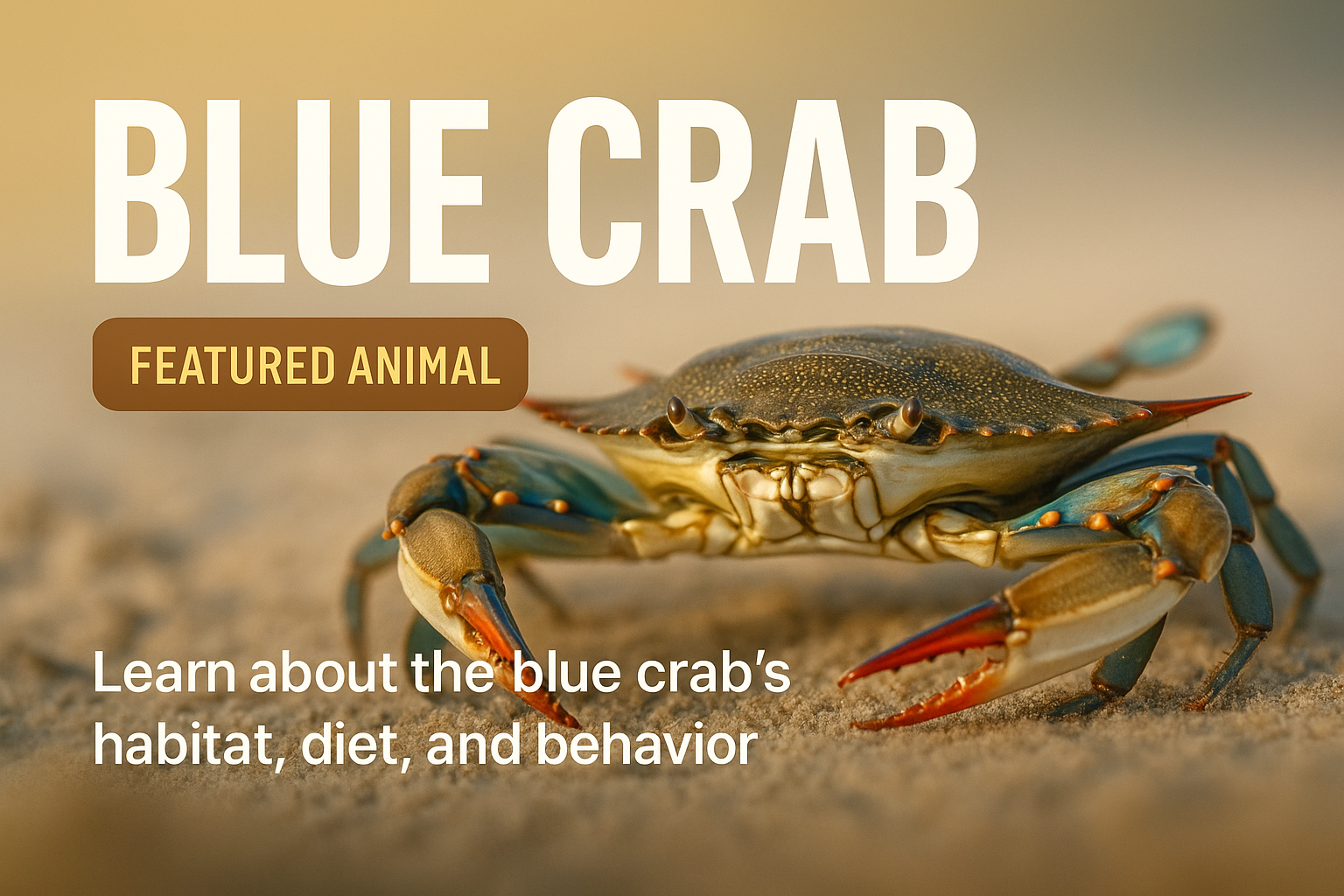 /Collection: /by davooda/Type: PNG/Engaging educational graphic showcasing the blue crab as a featured animal, highlighting its habitat, diet, and behavior with visually appealing imagery and design elements.