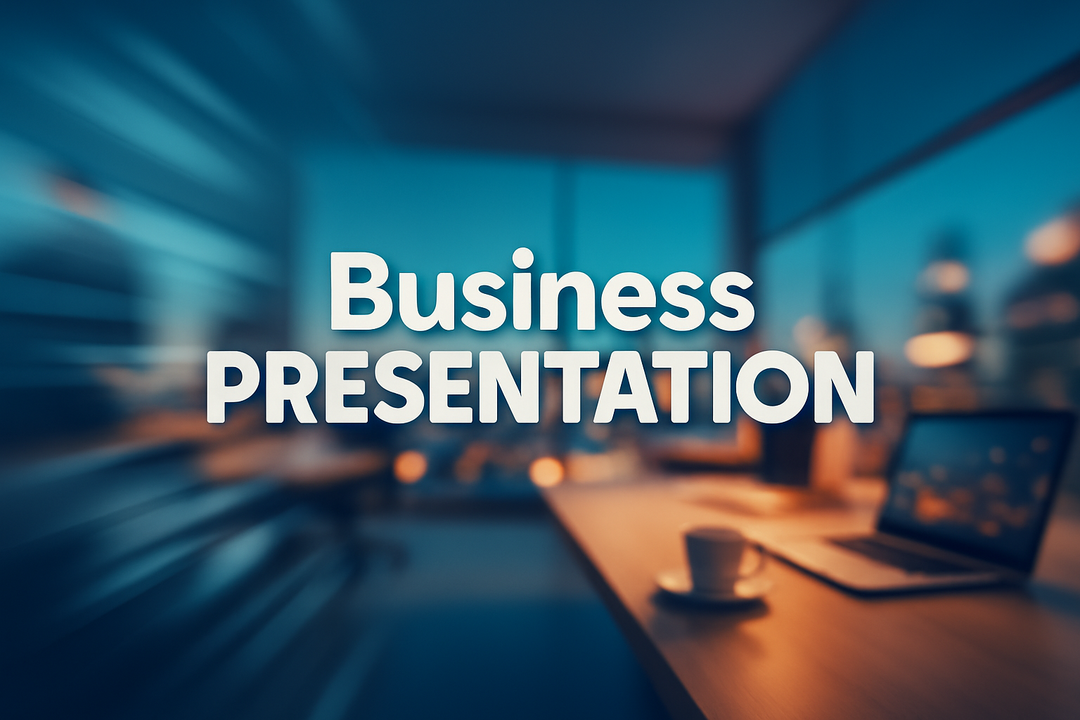 A blurred office workspace at dusk, featuring a laptop and coffee cup, with city lights in the background. The focus is on a bold title emphasizing 'Business PRESENTATION'.