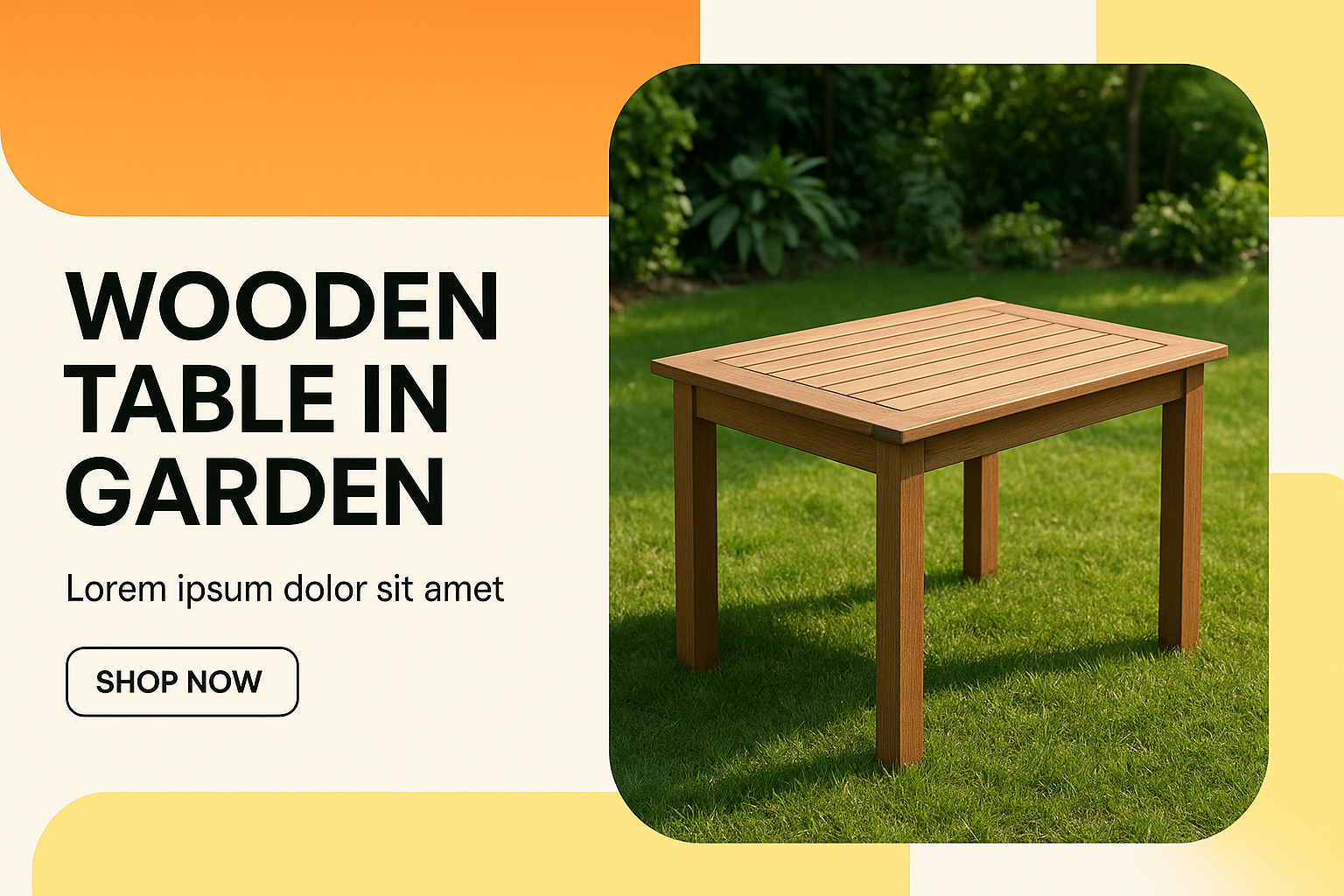 /Collection: /by davooda/Type: PNG/A well-lit wooden table set in a lush garden, featuring modern typography and a balanced layout. The design emphasizes clarity with geometric backgrounds and a call-to-action.