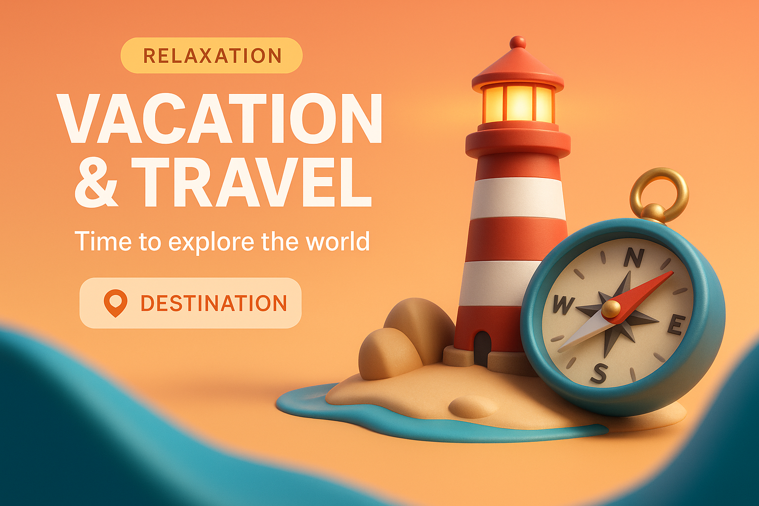 /Collection: /by davooda/Type: PNG/A visually engaging 3D graphic depicting a lighthouse and compass, symbolizing travel and relaxation. Ideal for vacation promotion or travel agency marketing.