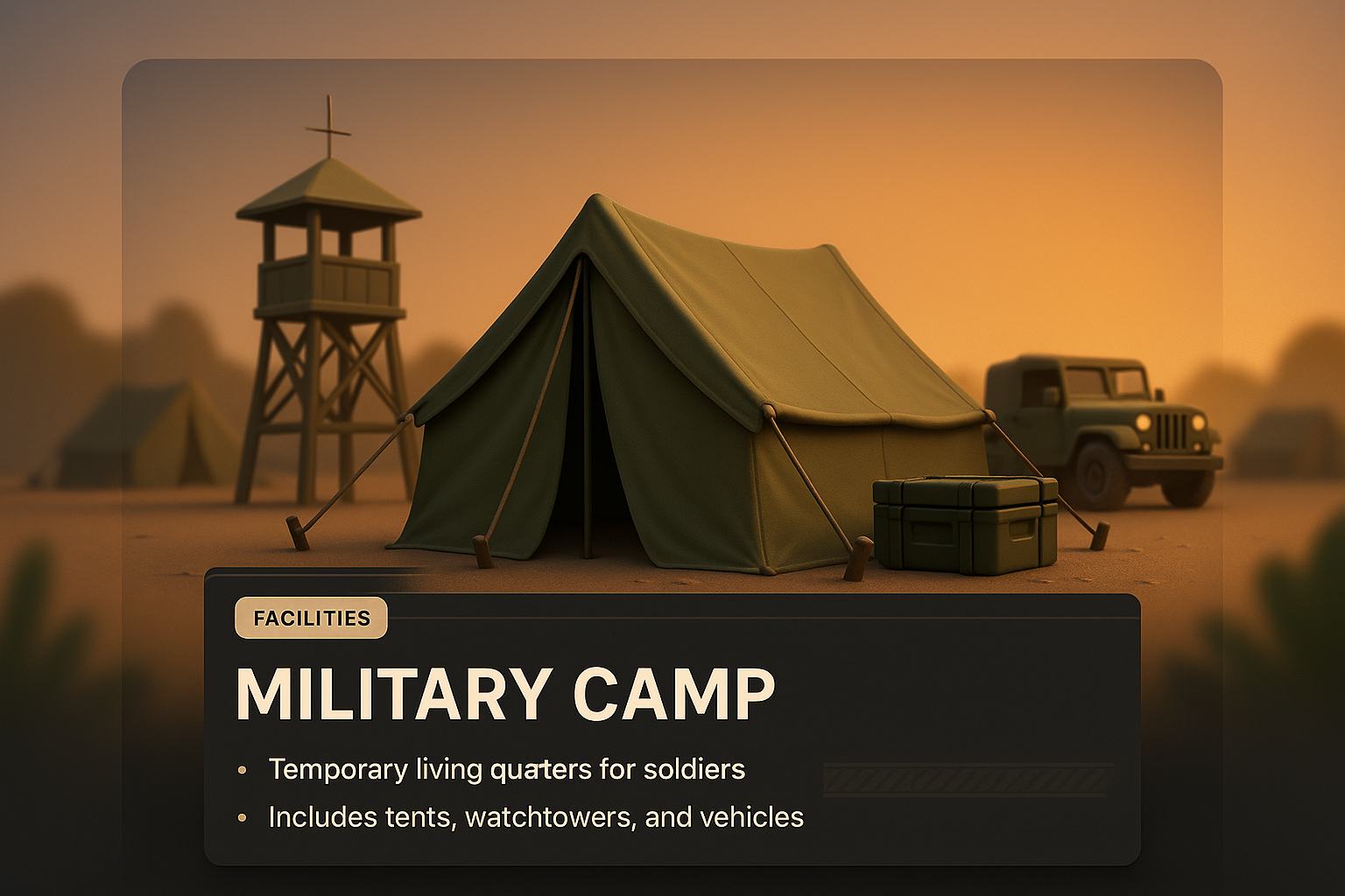 /Collection: /by davooda/Type: PNG/A visually striking 3D illustration of a military camp featuring tents, a watchtower, and vehicles. The design integrates text elements seamlessly with a dark label showcasing facilities available.