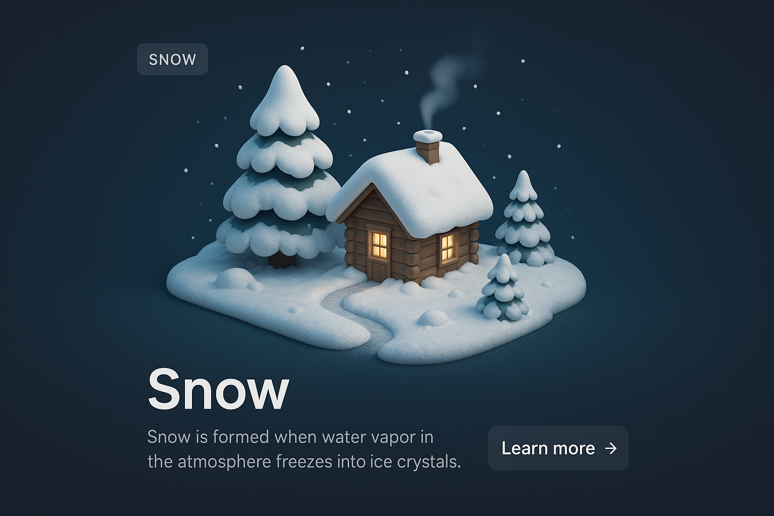 A charming 3D scene of a snowy landscape featuring a cozy cabin and pine trees. The dark background enhances the vibrant snow, creating a serene winter atmosphere.
